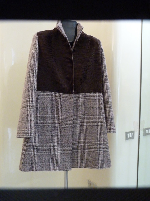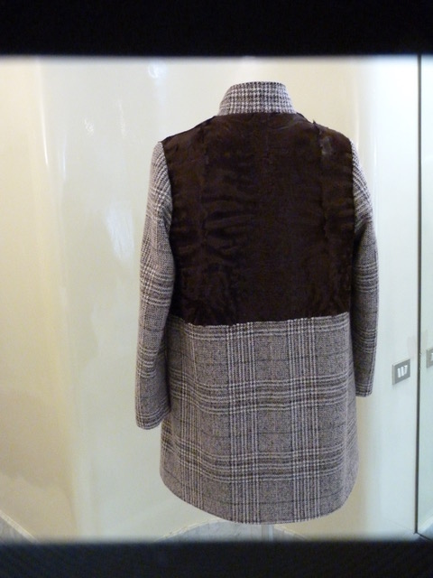 Cappottino con corpino di breitschwanz marron e tessuto a quadri 100% lana. Lunghezza cm. 89. Taglia M.