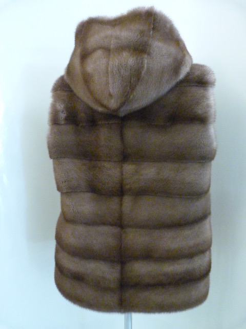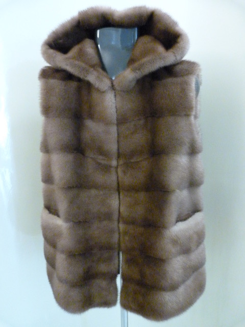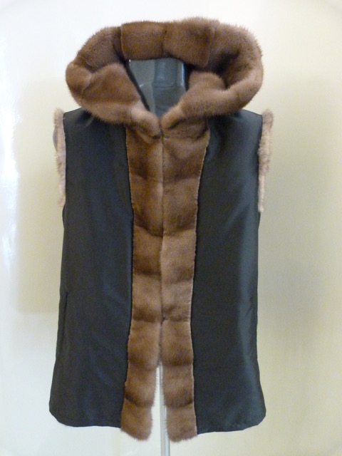 Gilet double face di visone royal pastel maschio di prima scelta con cappuccio. Lavorazione in orizzontale. Apertura tasche in orizzontale. Interno nero di tessuto impermeabile. Lunghezza cm. 67. Taglia M.