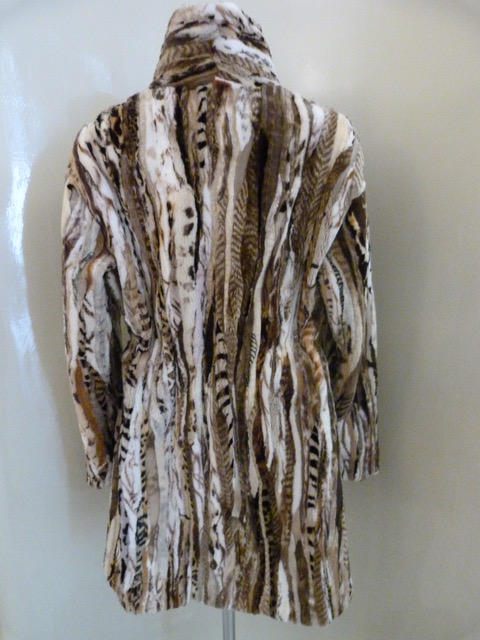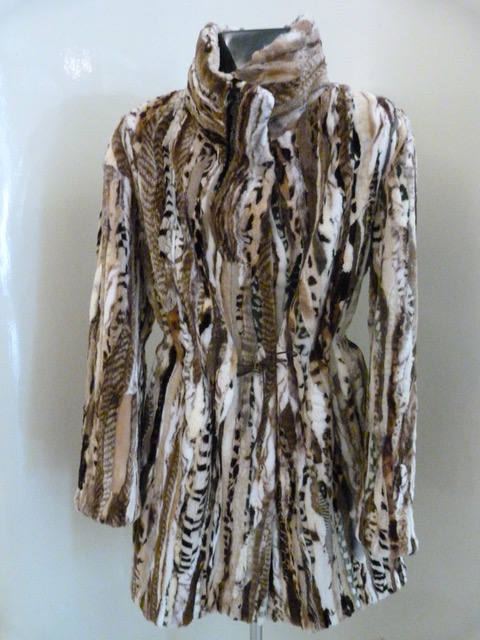 Giacca patchwork di visone rasato. Stretta in punto vita da coulisse. Lunghezza cm. 90. Taglia L.