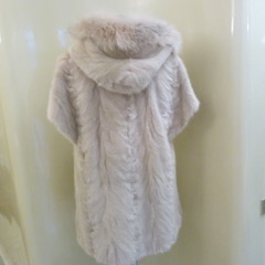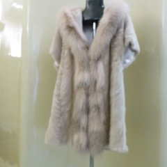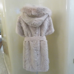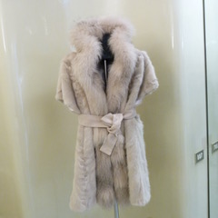 Gilet patchwork di visone con bordo di volpe rosa, cinta in camoscio dello stesso colore.